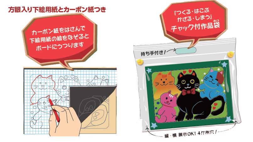 デザインが工夫できる方眼入り下絵用紙とカーボン紙でボードに簡単転写できる